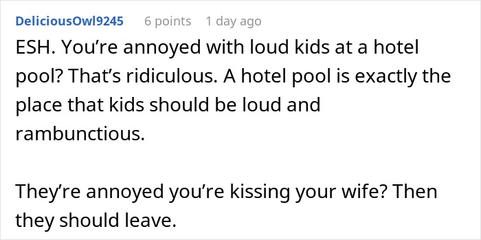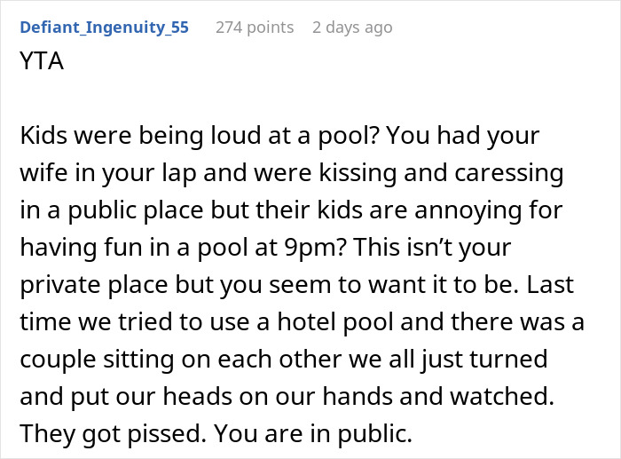 The couple got a bit touchy with each other in the hotel’s hot tub and got some critical comments from another married couple. The parents thought the couple’s behavior was not appropriate for their kids to see. The OP, in turn, snapped back at the parents, saying they should better control their children so they stop disturbing them and the other vacationers.