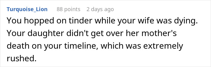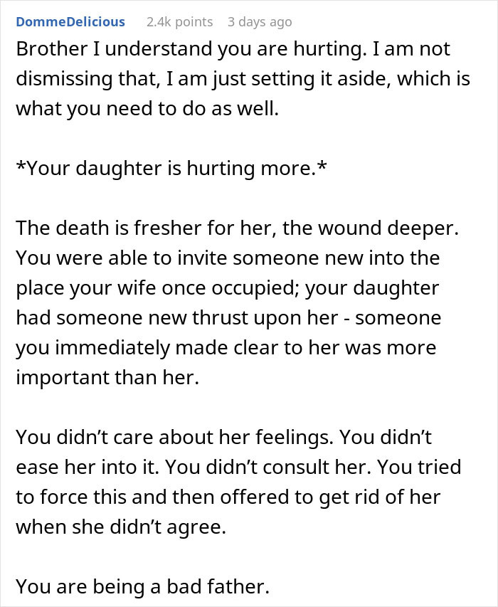 First and foremost, the husband and father it seems really has moved on from his first wife. On the face of it, this isn’t necessarily a bad thing, grief is a hard thing to overcome, so working through it is important. However, he didn’t seem to understand that his process was quite a bit different from his daughters. Some folks can move on easily, some never get over that one relationship. This is all to say, the father perhaps needed some therapy first before charging into the dating market.