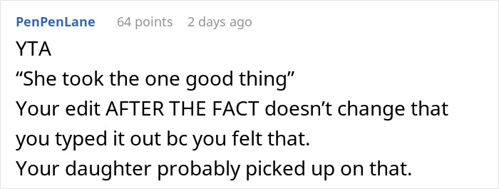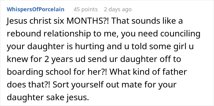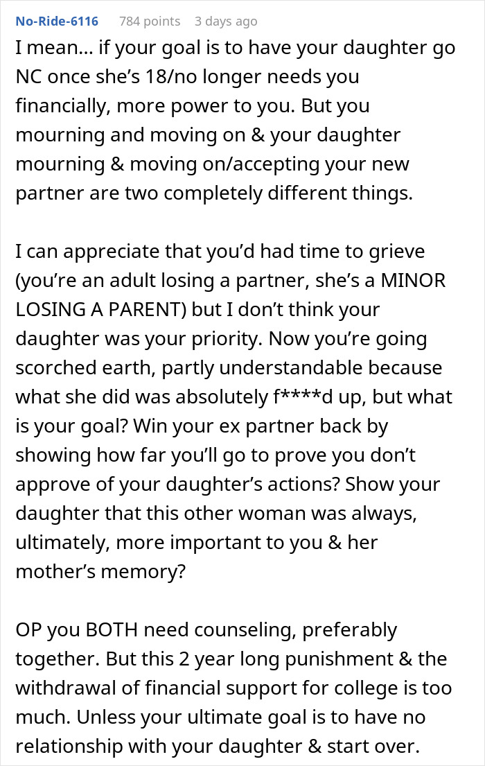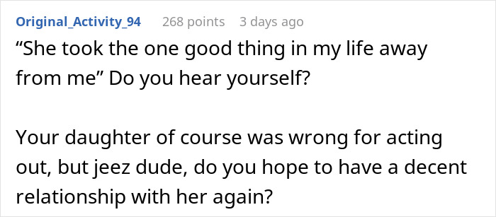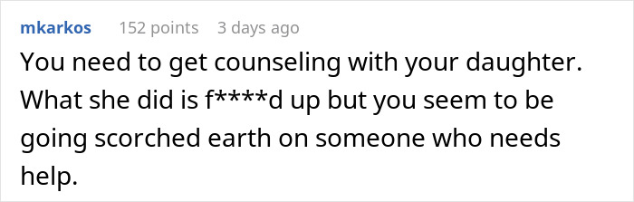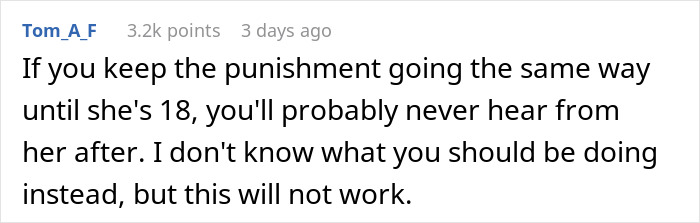 On top of that, the punishment he has decided on isn’t exactly life-ruining, but it’s downright horrible. Not only is he cutting her off from her social life, he seems ok ruining her chances at college. He blames her for ending his relationship, but it would appear that this was just the last straw, not a one-off event. Hopefully, he took the comments to heart and decided to rethink his life.