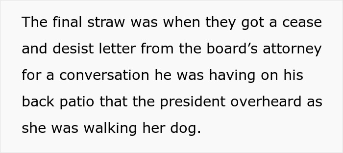 The HOA president even sent them a cease-and-desist letter after eavesdropping on their private conversations and pointing security cameras toward their house