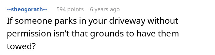 “If someone parks in your driveway without permission isn’t that grounds to have them towed?” one of the commenters asked reasonably. By the way, the hero of our other story also does this regularly. And what do you, our dear readers, think about the behavior of the characters in this tale? Please feel free to share your thoughts in the comments below.