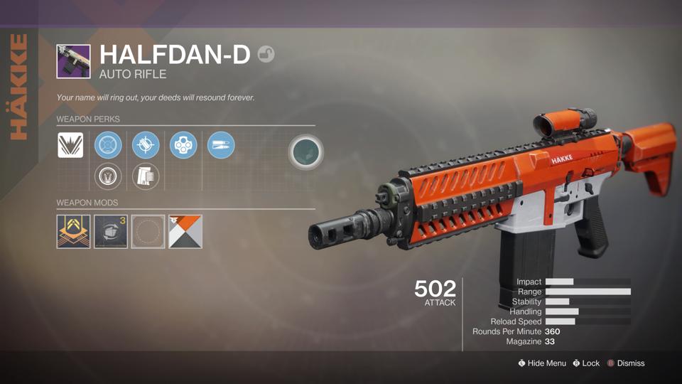 Bungie just brought back another Hakke weapon, Legal Action II, a pulse rifle, and it seems they realize that people want more Hakke stuff back. I would assume that Halfdan-D will be one of the new world pool additions, as it’s been confirmed older stuff is cycling out of there. So you’ll get it from world drops or Banshee.