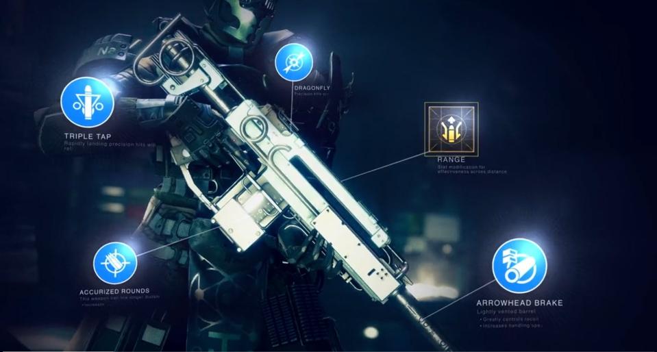 Not much is shown here other than the assumed basic ability to pick which perks go inside your gun. The same four slots on existing guns are shown with existing perks, plus a masterwork. But questions remain about if you can unlock multiple, switchable slots, and what Bungie is adding to weapons now that they don’t generate orbs intrinsically.