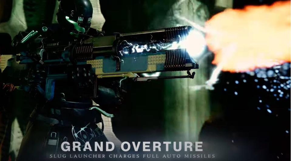 Exotic Slug Launcher Grand Overture – I literally have no idea what this thing is, as the closest thing I can compare it to is maybe Xenophage, but that’s it. It has a charged shot that shoots fully auto exploding missiles. Has to be a heavy weapon, I imagine.