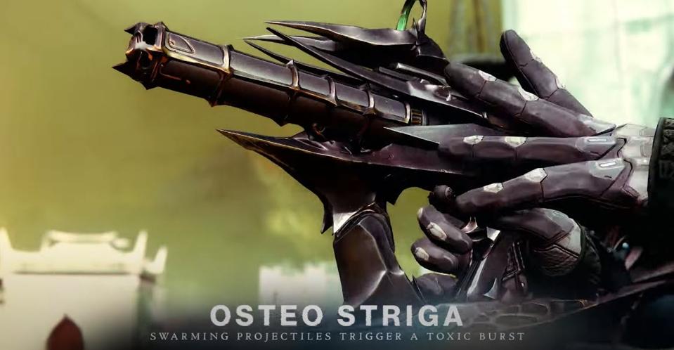 Exotic SMG Osteo Striga – This has “swarming projectiles that trigger a toxic burst” which sounds a whole lot like an SMG version of Necrotic Grips Thorn. It also reinforces the idea that we are probably marching toward a “toxic” element in this game someday.