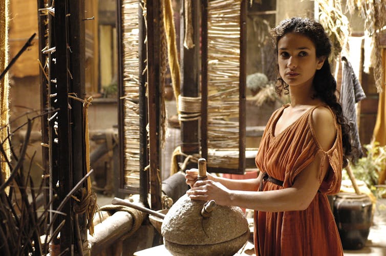 In the TV series Rome(2005-7), legioniary Titus Pullo gives some advice to centurian Lucius Vorenus, who wants to give pleasure to his wife Niobe.