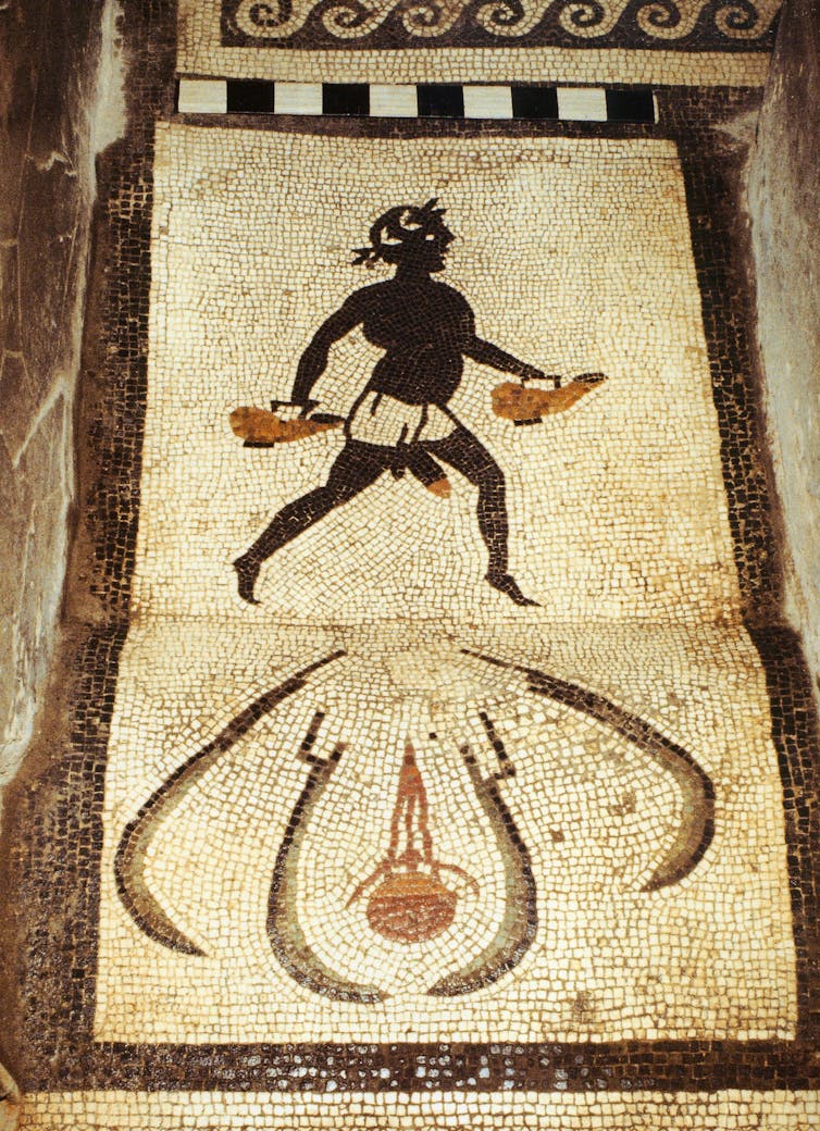 In the upper part of the mosaic, a young African servant is running, holding two phallic vases, while his big penis bursts from his tight loincloth. It’s certainly a way to get a laugh out of onlookers with the juxtaposition of this comically virile image with the suggestion of the female organ, made up of items of men’s sports equipment.