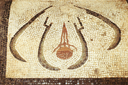On the House of Menander mosaic, the vial of oil, seen from one side, takes on the appearance of a sharp weapon – a kind of dagger. It chimes with the definition of the clitoris given by Greek poet of the 1st century AD Nicarchus, a writer of satiric epigrams. Casting scorn on a certain Demonax, skilled at cunnilingus, Nicarchus wrote, “The pig (‘khoiros’) has a fearsome prickle (‘akantha’)”.