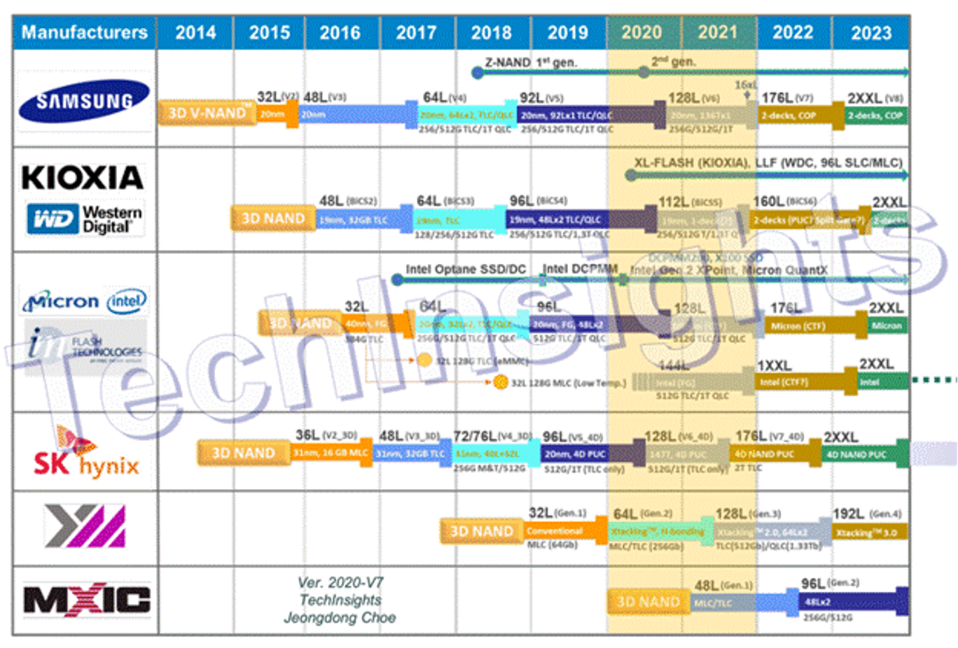 Micron was the first to announce 176-layer NAND flash in 2020 followed by SK hynix, late in 2020. WDC and Kioxia announced a 162-layer NAND flash in February 2021. Samsung released its 7th generation V-NAND in a consumer SSD in 2021.