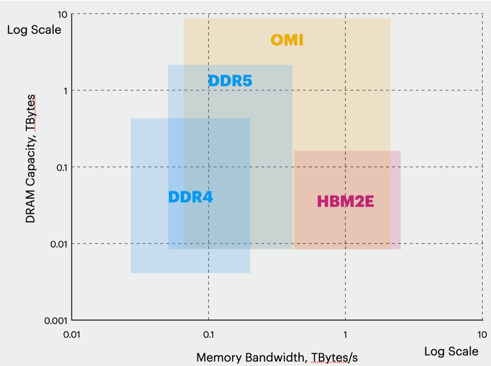 Note that OMI can provide close to the performance of HBM and more memory capacity than either DDR or HBM. This combination of high capacity and performance in near memory could be very useful for some computing applications.