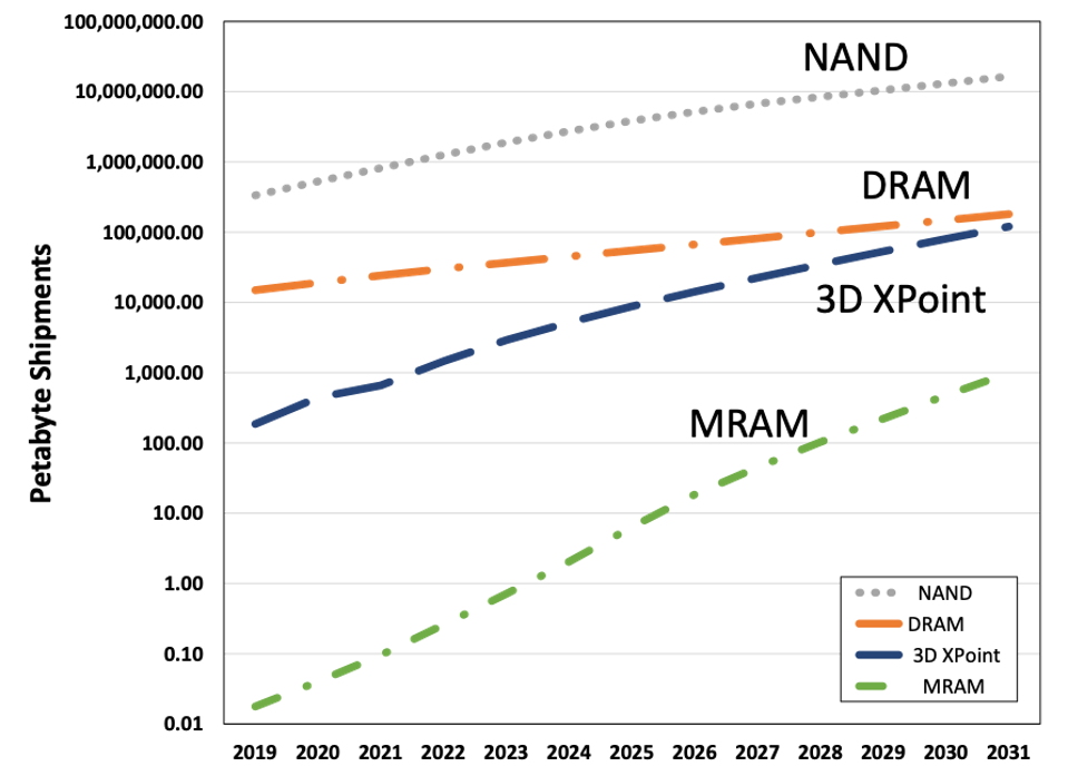 The image below from a recent report by Coughlin Associates and Objective Analysis (Emerging Memories Take Off) shows projected growth of NAND flash, DRAM, 3D XPoint and MRAM annual shipped capacities out to 2031. Total revenue from the emerging memories will likely exceed $44B by 2031, driven by standalone as well as embedded applications.