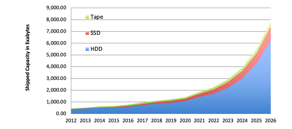 Overall demand for storage technology of all types continues to grow, as the total amount of stored data increases. This storage capacity demand will drive demand for all types of storage technology. The chart below shows historical trends and our projections for the growth in shipped storage capacity for magnetic tape, HDDs and SSDs. Note that we have recently increased our projections for magnetic tape capacity growth.