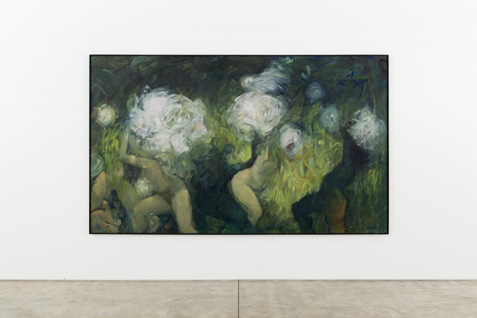 “I began in 1984 to paint on a large canvas, in greens and whites, something I felt about those spirits, which may have been flowers but also novas, tears, omens, God knows what, contending or conniving with our own ancestral shape in a place I'd give anything to know. During the painting of the picture, a matter of three years, it went through a number of transformations,” Tanning wrote. “At times I thought it was finished, that I had done what I could. Once it was even photographed, friends gazed at it, a turbulent image from a feverish brush. And then it was attacked again, radically changed, its white icons whiter, its human reference clearer. Late in 1987 it was finished.”