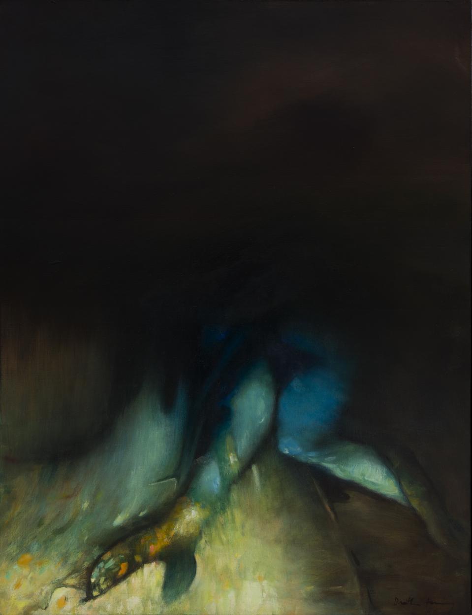Indulge and immerse yourself in the lush, primordial darkness of Pour Gustave l'adoré (1974), an homage to nineteenth-century French artist, printmaker, illustrator, painter, comics artist, caricaturist, and sculptor Gustave Doré, who created illustrations for Dante Alighieri's Divine Comedy and Samuel Taylor Coleridge's Rime of the Ancient Mariner. The eye is pulled to the lower canvas where a woman’s leg morphs into what could be a crab or a mermaid’s fins, emphasized by pelagic colors.