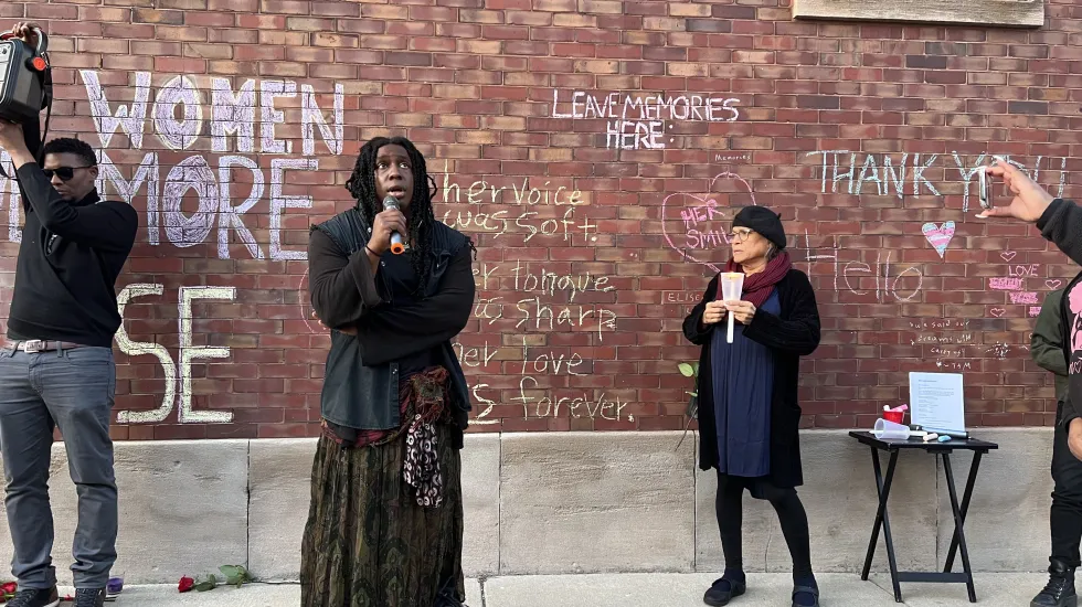 A chalk-decorated wall acted as the backdrop for the gathering, with messages about Malary including, “Her voice was soft. Her tongue was sharp. Her love is forever,” and “her heart was bigger than the universe.”