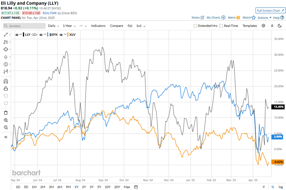LLY has outperformed the broader markets over the past 52 weeks, with shares up 13.4%, compared to the S&P 500 Index's ($SPX) 4.5% gain and the Health Care Select Sector SPDR Fund's (XLV) 3.8% dip over the same period.