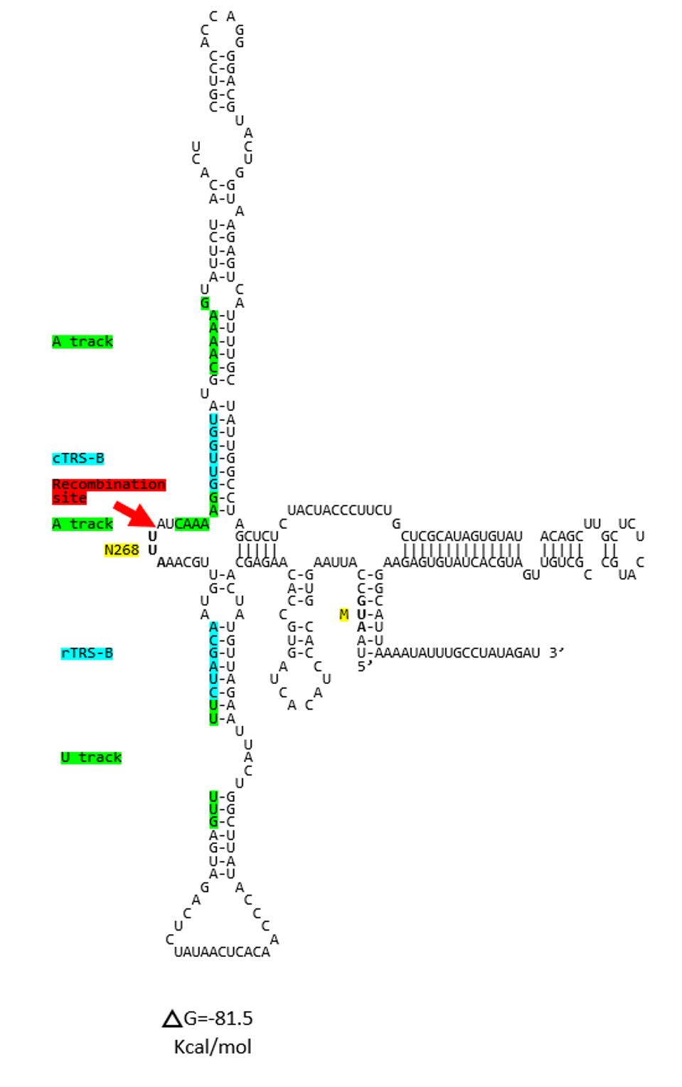 Roberto Patarca (personal communication) identified one such stable secondary structure at the recombination junction of recombinant “GM” pictured in Figure 3 projected to be extremely stable and, therefore, a site for polymerization pausing. It is predicted to have -89kcal stability, where a greater negative value is associated with higher stability.