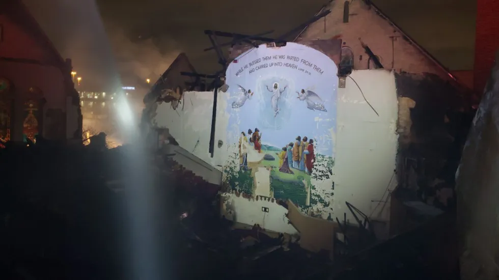 The fire appeared to begin in the upper rear area of the church and caused the roof to collapse.