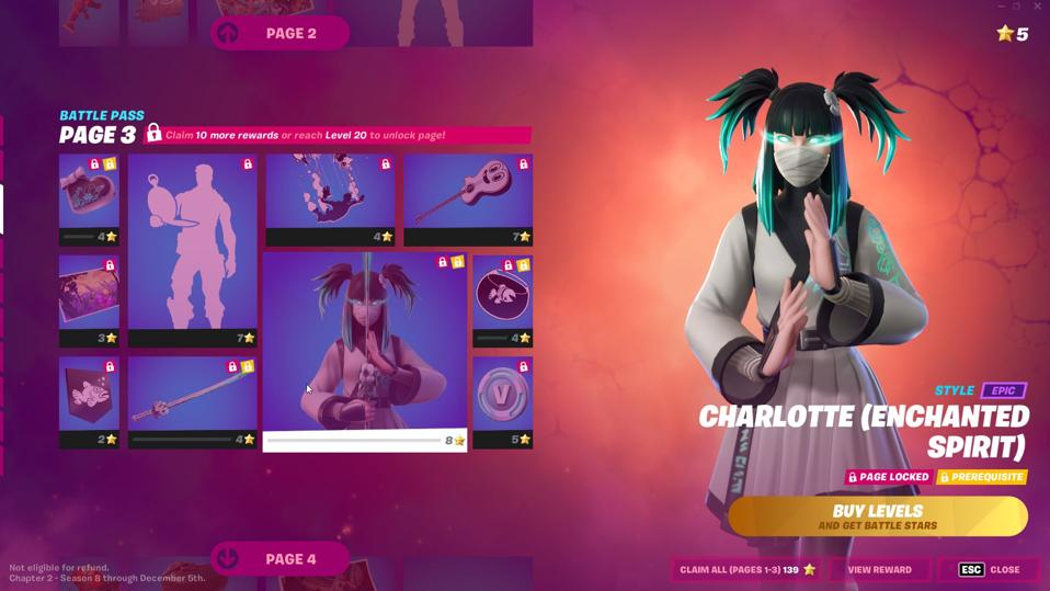 Page 2 - No skins here, but this is where you can flesh Charlotte out with her sword and emote and such. It’s a pretty cool sword, I have to admit that.