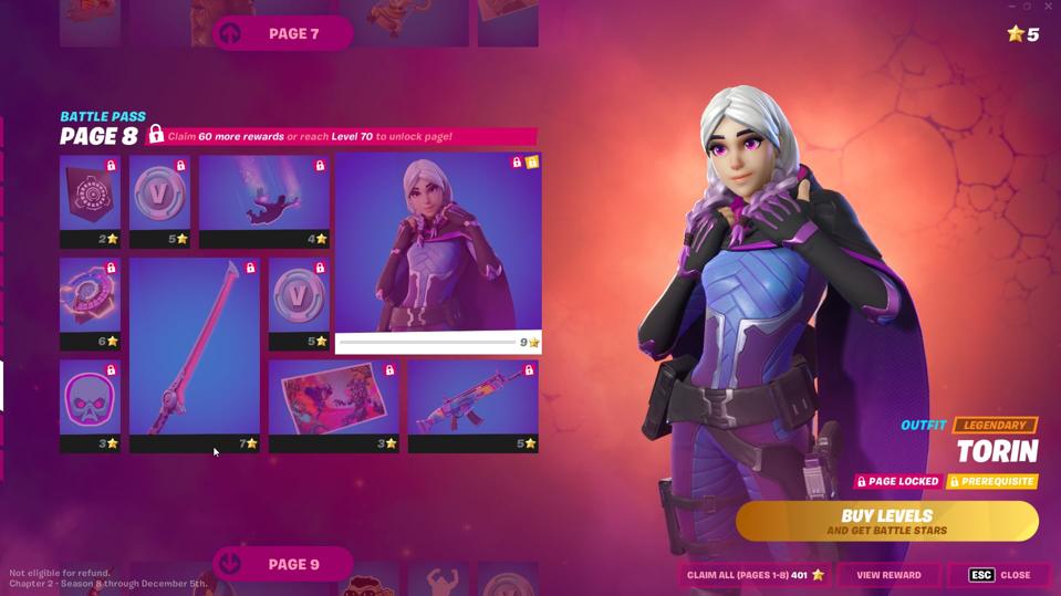 Page 8 - Now we arrive at Torin, who fronts most battle pass art and is sort of Elsa from Frozen with space armor on. She also has a cool sword like her friend Charlotte you can unlock on this page.