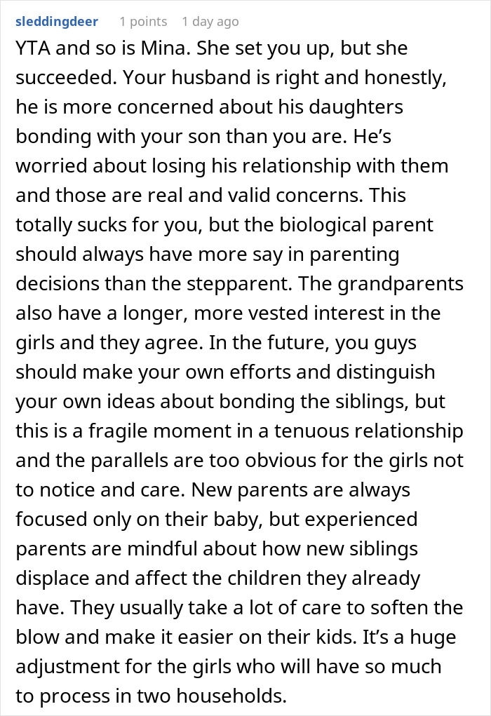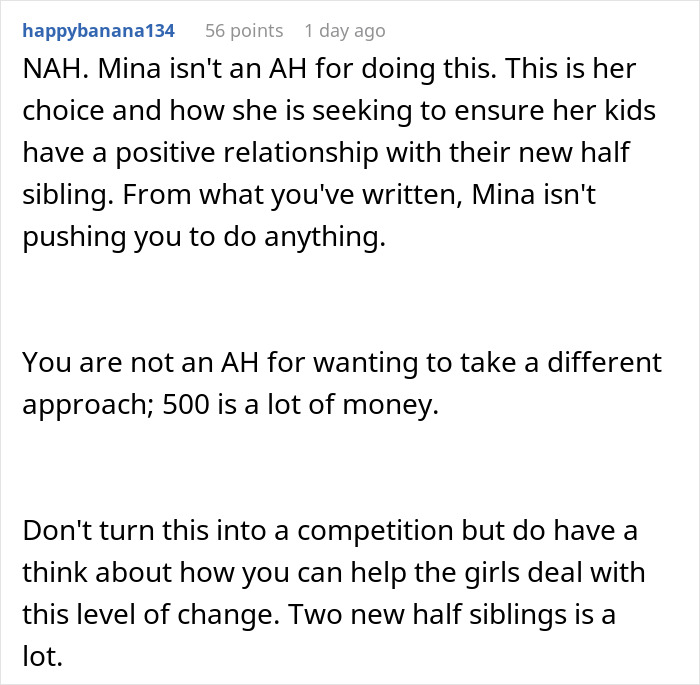 Unfortunately, the tension was impossible to avoid as after the ex-wife bought $1000 worth of gifts for her girls “from the baby”, the OP’s husband started wondering if they should do the same, which the redditor refused to do. Fellow netizens also seemed to share differing opinions on the matter, which they expressed in the comments section.
