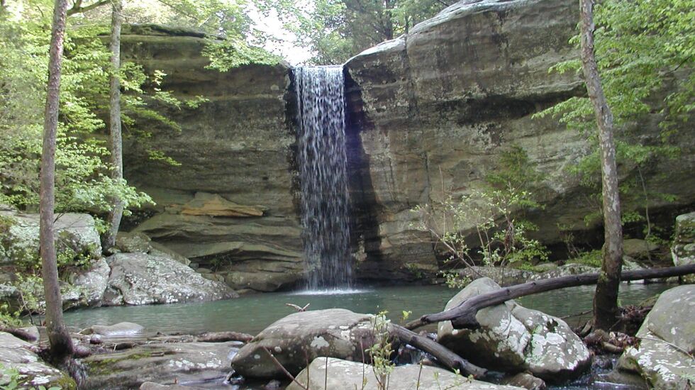 Shawneeforest.com recommends taking the switchback trail to circle back to the Twin Falls of Burden Falls to view “the ruggedly majestic cliff faces of Burden Falls.”