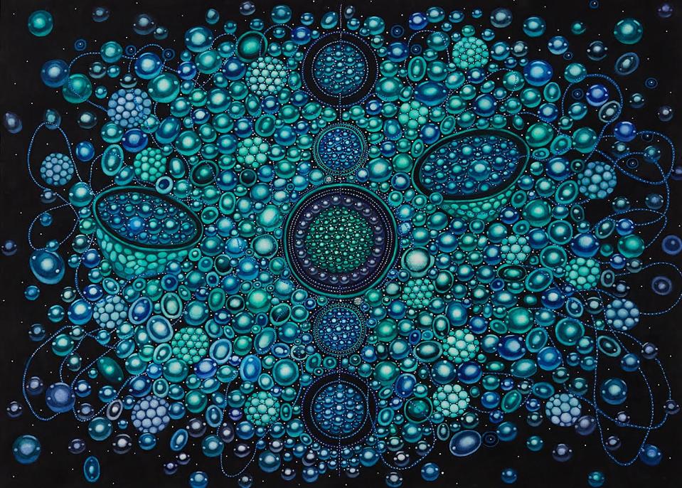 Glistening blue and green orbs and biomorphic shapes erupt from a dense black background, drawing our gaze into and around the pulsating canvas. Oscillating like a close-up of atoms, we confront our position in a hypothetical collection of potentially diverse observable universes.