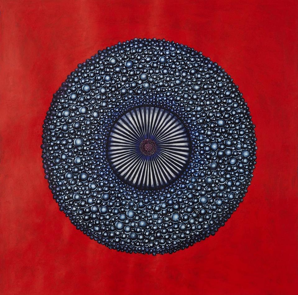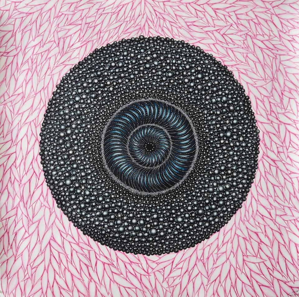 Transport yourself to a world of infinite possibilities with Portal Series - Untitled 3 (2018), the sanguine background evoking a lush, velvety sensation, juxtaposing the dazzling black pearls that summon the protective properties of hematite or obsidian, and surrender to the array of beckoning spirals that soften toward the radiating center.
