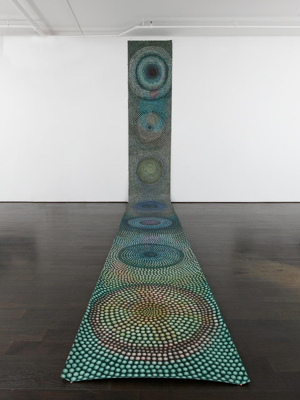 Get swept away by Kim’s Scroll Series, following the rhythmic patterns as they caress the ground. Kim said people often wrongly assume the series is rooted in her Asian cultural background, but it’s simply an extension of her vast and evolving creative process.