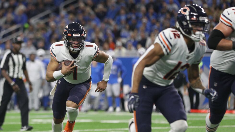 Fields stumbled around left tackle Braxton Jones as he and a defender tumbled to the ground at the Bears’ 46 — “I was just trying to stay up,” he said — but wasn’t touched as he ran up the left sideline. Safety Kerby Joseph dragged him down after a gain of 31.