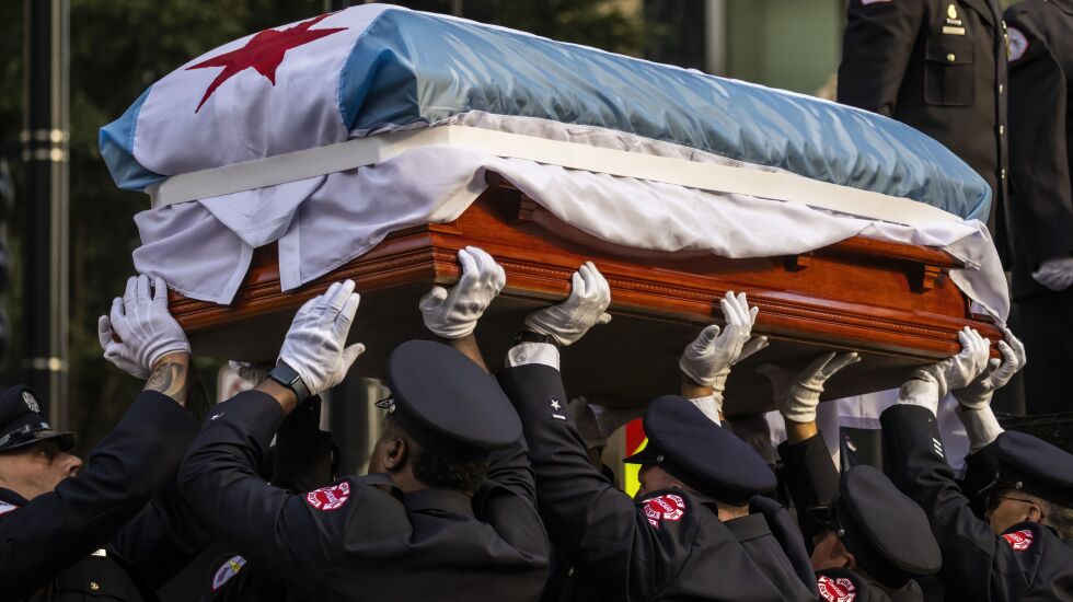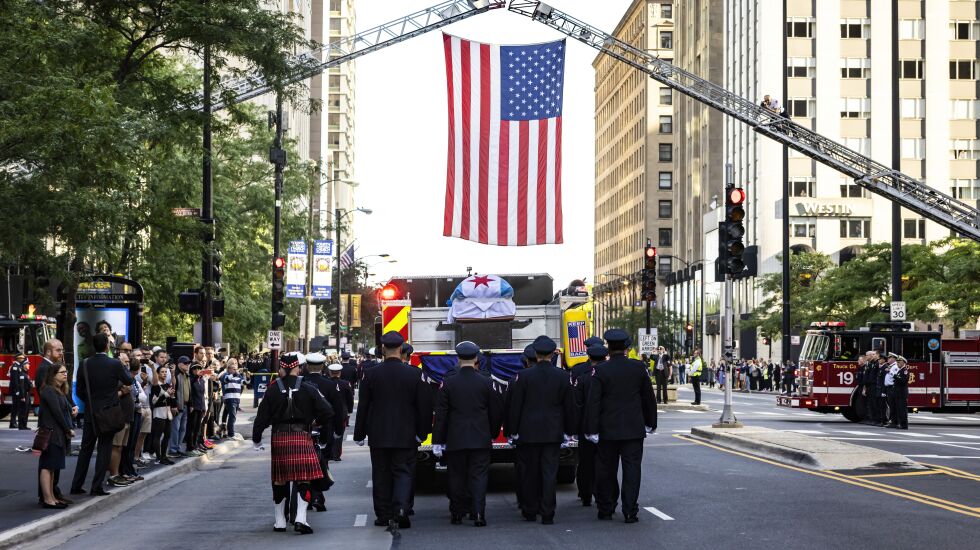 Firefighters and Chicago police officers lined up and saluted as the procession made its way to the steps of the Fourth Presbyterian Church for visitation and funeral services.