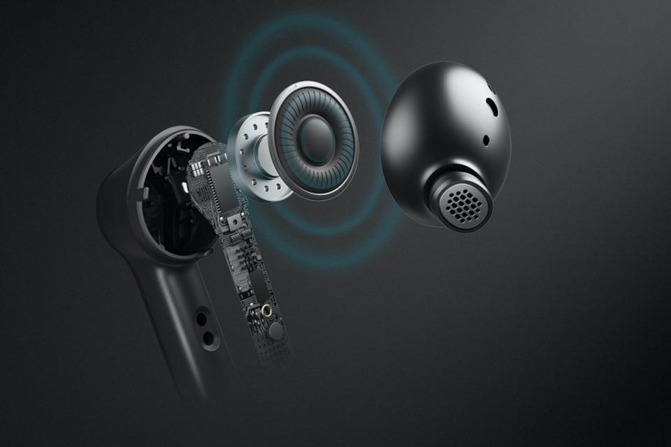 These earbuds include six microphones which are used for both sampling sound to be cancelled by the hybrid ANC circuitry and for picking up the user’s voice when making phone calls and video chats.