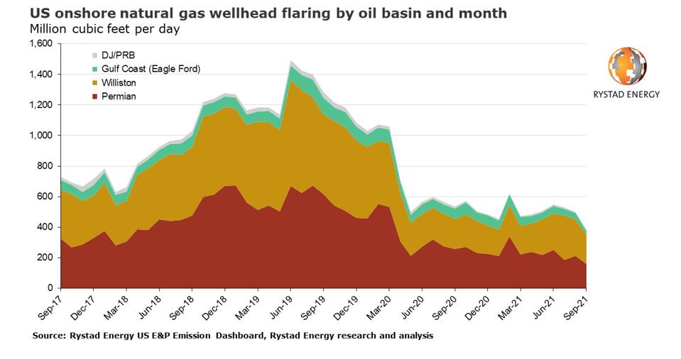 But in the Permian, average flaring intensity has declined from 3.2% in 2020 to 1.6% in 3Q of 2021 for the 50 largest gas producers.