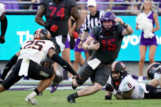 The Heisman Trophy race (5) got another alteration, as three quarterbacks in the mix all lost in startling fashion despite playing outstanding games: Alabama’s Bryce Young, Oklahoma State’s Spencer Sanders and USC’s Caleb Williams combined for 1,262 yards of offense and 10 touchdowns, but walked away dejected. “I hate losing,” Williams said, eyes red. “I had some emotions.” But say hello to the three gunslingers who beat them: Tennessee’s Hendon Hooker, TCU’s Max Duggan and Utah’s Cam Rising combined for 1,259 total yards and 13 TDs—and, most importantly, three big wins.