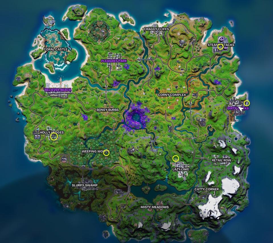 So, where are they today? Most of these you will be needing to find in more urban areas of the map, and I’ve marked them with yellow circles below: