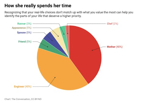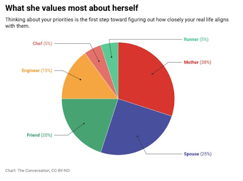Imagine you are asked to carve a pie to illustrate your different roles and how important each is to the way you feel about yourself and the values you prioritize. You might value your roles as a mother, a spouse and a friend most highly, assigning them the biggest pieces of your pie.
