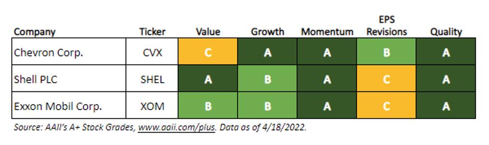 Using AAII’s A+ Stock Grades, the following table summarizes the attractiveness of three petroleum stocks—Chevron, Shell and Exxon Mobil—based on their fundamentals.