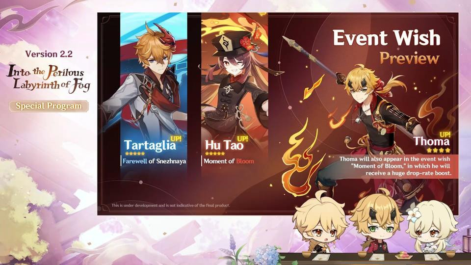 The Special Program today announced that Genshin Impact’s next two banners will feature re-runs of Childe and Hu Tao, the hydro bow and pyro polearm 5 stars respectively. The catch is that Hu Tao’s banner will also feature a new 4 star pyro polearm, Thoma, whom we’ve already met a bunch of times in Genshin Impact’s Inazuma story.