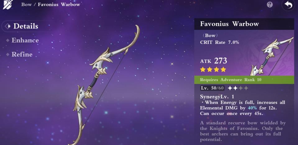 Favonious Warbow (4 star) - CRIT Hits have a 60% chance to generate a small amount of Elemental Particles, which will regenerate 6 Energy for the character. Can only occure once every 12s.