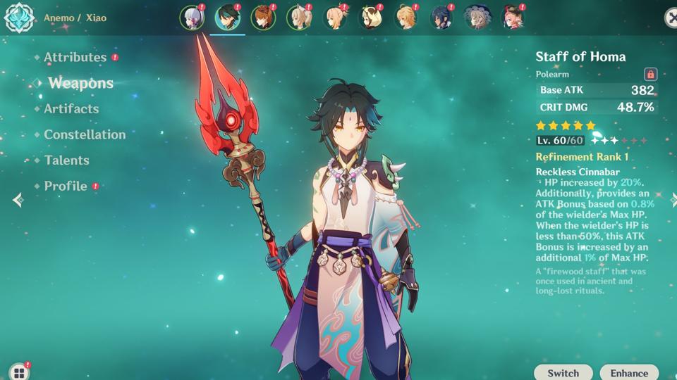 Staff of Homa (5 star) - HP increased by 20%. Additionally, provides an ATK Bonus based on 0.8% of the wielder’s Max HP. When the wielder's HP is less than 50%, this ATK Bonus is increased by an additional 1% of Max HP.