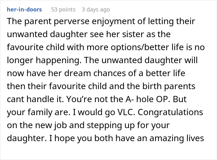 And people online assured her she wasn’t. In their eyes, since the OP adopted the girl, she’s her mother now, and it’s OK she’s kind of spoiling her. This girl was never favored in her birth family over her twin sister. And the second the mistreated child one got some positive attention, they showed up at her doorstep with pointless accusations, like OP being the one who tore up their family. Well, netizens found this point to be a stupid one — after all, the OP’s sister asked her to adopt one of her daughters. And that’s the action that tore up the family, not the spoiling of the adoptee.