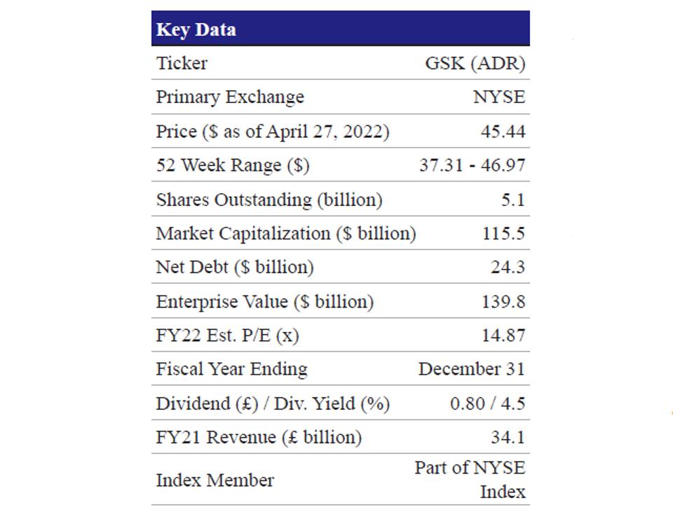 We compare GSK with listed companies in the pharmaceutical and vaccines industry, including AstraZeneca, Pfizer, Novartis, Merck, Roche Holding, and Baxter International. We apply multiples at a discount vs. peer median to factor in the persistent drop in the Pharmaceuticals and Vaccine segment’s revenue share in the group’s revenue that has impacted the group’s overall performance in the past. The valuation discount is also attributable to the expected pressure on costs due to higher supply chain costs and the rising inflationary environment. Moreover, our conservative valuation also factors in the recent halt in Phase-3 of the maternal RSV vaccine program over safety signals. However, we believe that the company is better positioned compared to peers, considering established and a leading brands, and new pipeline of innovative products. Accordingly, we arrive at an Enterprise Value of £111.8 billion. Subsequently, we deduct net debt of £19.4 billion (1Q22) to arrive at an implied equity value of £92.4 billion. Considering diluted shares outstanding of ~5,068 million at the end of 1Q22, we arrive at a target price of £18.00 per share. After taking into consideration the ADR ratio of 2 and GBP/USD spot exchange rate of 1.25, we arrived at the target price of $50.00 per share for ADR and maintain our Buy rating on GSK.