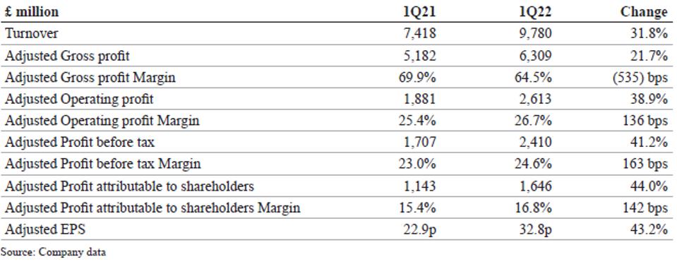 Adjusted Gross profit grew 21.7% YOY to £6.3 billion, while corresponding margin contracted ~535 bps to 64.5% (Consensus: 66.5%). Adjusted operating profit increased 38.9% YOY (CER: +39%) to £2.6 billion (+15.5% vs. consensus), while the corresponding margin reached to 26.7% (1Q21: 25.4%). Adjusted profit before tax grew 41.2% YOY (CER: +41%) to £2.4 billion (+15.3% vs. consensus), while the corresponding margin expanded ~163 bps to 24.6%. Adjusted Profit attributable to shareholders increased 44.0% YOY (CER: +44%) to £1.6 billion (+13.9% vs. consensus), while the corresponding margin widened by 142 bps to 16.8%. Adjusted EPS for the quarter stood at 32.8p (1Q21: 22.9p, CER: +43%).