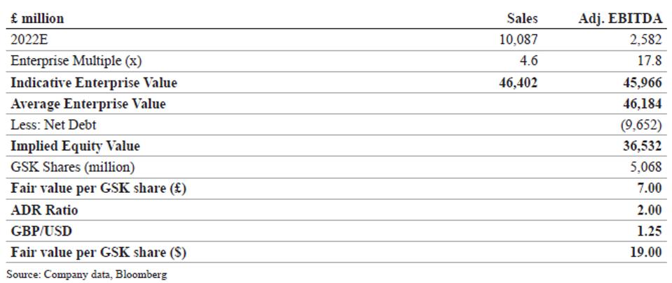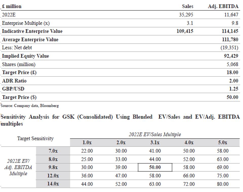 In our Sum-of-the-Parts (SOTP) valuation, we value New GSK (Stub) and Haleon (Spin-off) using the blended relative valuation method (EV/Sales and EV/Adj. EBITDA) based on our FY22E Sales and Adjusted EBITDA estimates. We have done valuations using the currently available information and are subject to modifications once the company provides additional details on the spin-off deal in the Form 10 filing.