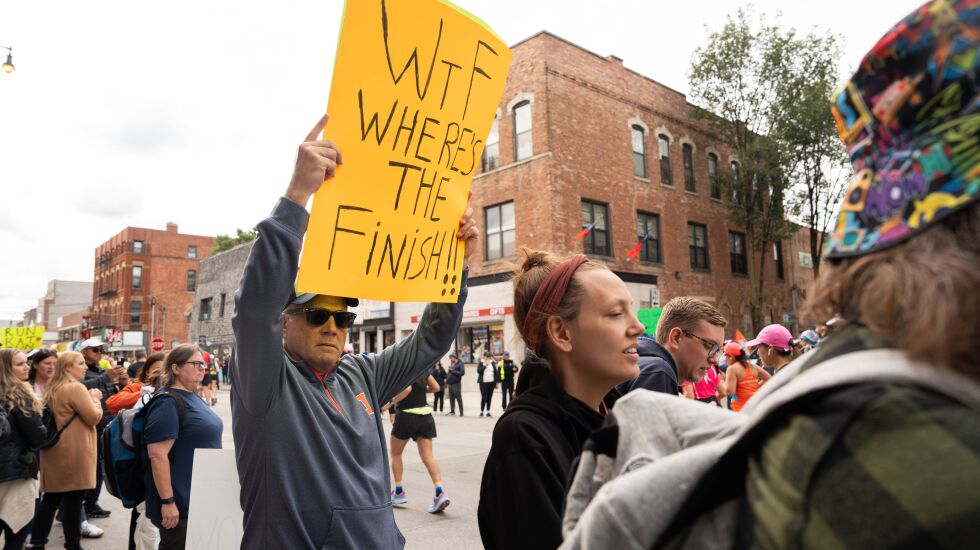 From pop culture references to digs at politicians, Chicagoans showed their creativity and wit as they cheered on runners Sunday. As people ran, walked or limped by, giving a hurried hug or exhausted high-five to spectators, they also giggled at the phrases drawn in Sharpie on poster board.