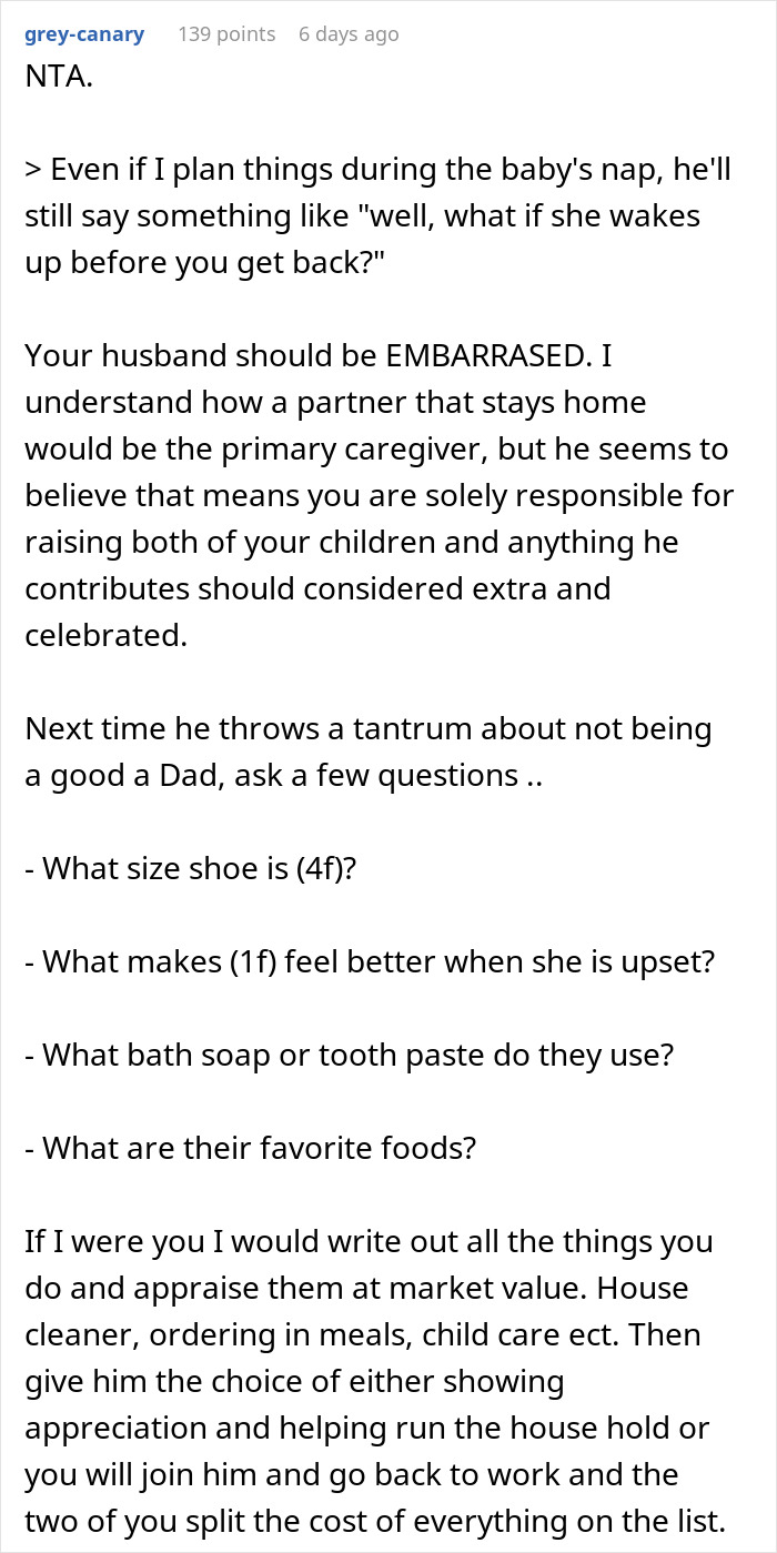 So it’s understandable that the stay-at-home parent might need a break. It seems that the mother in this story doesn’t get time off being a SAHM. And if the father really wanted a break from the kids, the parents could’ve considered leaving the kids with another family member or hiring a nanny for the day.