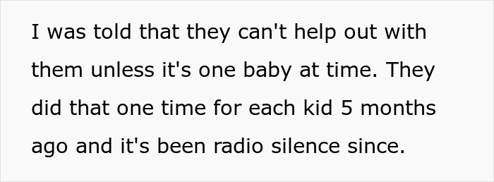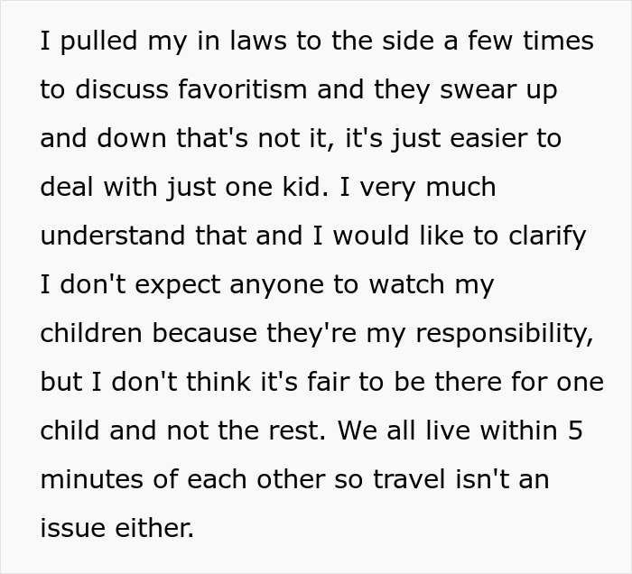 The OP did mention to her in-laws that she felt hurt by their absence from the lives of the triplets. They had work and other responsibilities, but she wanted them to be there for the children just like they were for their other grandkid. They made the excuse that caring for three children was too hard, and that’s why they weren’t so involved.