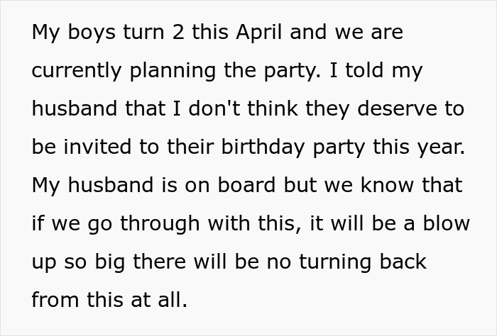 Since the woman felt so strongly about her in-laws’ favoritism, she decided not to invite them to her triplets’ second birthday party