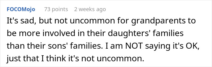 The woman noticed that her in-laws prioritized their other grandchild and seemed to show him favoritism, so she discussed the matter with them, but they denied doing so