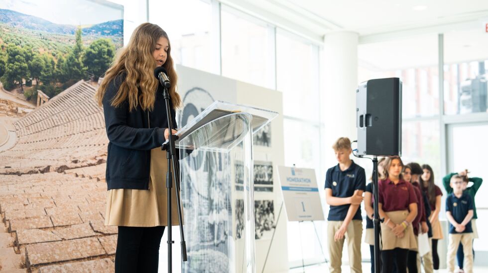 The middle schoolers giggled and wrung their hands as they prepared to deliver three-minute passages. Lillie Vogdanos, 13, said she played with a hair band on her wrist to calm her nerves as she waited her turn to read a passage in Greek.